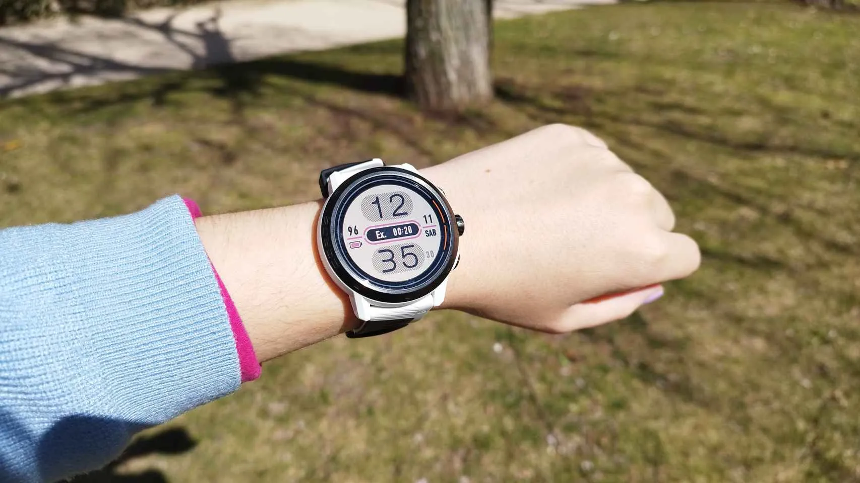 El blanco y el gris que tanto destacan en la muñeca representan la nieve y la roca de las laderas. Estos tonos también están presentes en las correas. Ambas son cómodas y transpirables, pero una es de silicona blanda y la segunda está fabricada con nailon. La pantalla de 1,3 pulgadas es táctil con buena resolución (260 x 260 píxeles) y capacidad de representar hasta 64 colores de cristal de zafiro. La retroiluminación facilita ver los elementos incluso a pleno día. En esta pantalla las notificaciones se ven con claridad aunque simplemente con el texto básico para saber si son importantes o no. Coros Apex 2 Pro de Kilian Jornet Marta S. R. El hecho de contar con el dial lateral y la pantalla táctil hacen que la experiencia para controlar el mapa sea más óptima al agrandar la imagen o moverse por la ruta.