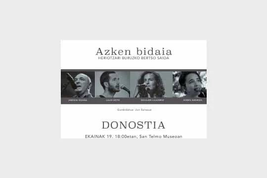 "Azken bidaia" bertso-saioa: Andoni Egaña + Maialen Lujanbio + Julio Soto + Miren AmurizaGertaeraren datuakNonSan Telmo MuseoaNoiz19/06/2021IruzkinakHasi saioa iruzkin bat argitaratu ahal izateko.{{appName}}-n izena eman!